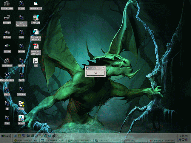 Makes the System Tray, Task Bar and Start Button transparent. When mouse is over them, it will make them NOT transparent. Simple eh? I take no credit for the .bas file in the project. I took it from another project that makes any for transparent. This code was inspired by another submission a few days ago that was suppose to do the same thing, but the coder neglected to unclude the .bas that contained the functions needed for the program to work. So I made my own and here it is. You may steal, copy, delete or do whatever you want with this code, I don't mind.. Learn from it and enjoy it is all I care.. Note: may not work for older Operating Systems.