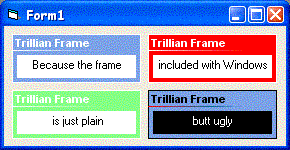 Looks like the frame used in Trillian Pro 2. Why? Cause the frame included with windows is just plain ugly. Now uses variable colors, and corrects the gradient to match