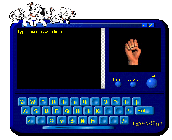 It sports a virtual point and click keyboard. By ether hitting a key or typing directly into the console, Type-n-sign will then show the appropriate hand sign. Has play back, continuous play, and Speed control features. Even supports the ability to switch out hand modules (Have a Web or Digital Cam? Customize/personalize Type-N-sign to your needs...) Current module was created using poser.