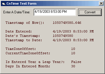 This module is a collection of various time functions, including the generation of GMT offset UNIX Epoch timestamps, Leap Year calculation, Days In Month calculation, and the completely unique GetTimeZoneOffset(), GetCurrentTimeZoneOffset() and isDaylightSavings() functions! I was unable to find any VB code for timestamp generation, so I had to make my own! Have you ever needed to compare dates that were created in two different countries? If so then you've probably run into the differences in dates in various regions of the world. The US formats dates as "mm/dd/yy" where as most of the rest of the world uses "dd/mm/yy". This is all fine and good, until you need to compare one to the other. According to VB's documentation, the date format is defined by the local systems settings. This has the effect of improper comparison when equating dates generated in two different regions. IE - is CDate("3/4/03") March 4th or April 3rd? VB makes the assumption that the date was generated on the local system, so if the local system's format is different then the system that generated the date it will be incorrect. It becomes even more fun when dealing with other languages! CDate("Mar 4, 2003") will generate an error on a non English machine as "Mar" is not a recognized month or abbreviation. Utilizing a GMT offset UNIX Epoch timestamp can avert this issue. The timestamp is the number of seconds that have elapsed since the epoch (January 1 1970 00:00:00 GMT). So instead of storing "3/4/03" you store "1046700000" which is the number of seconds between March 4th, 2003 and the epoch. Best of all, this module allows you to convert back from a timestamp into a date variable, allowing you to format it for the local user. ** In a nutshell, utilizing a timestamp in place of a locally formatted date will allow you to correctly compare dates no matter what language or format was used during the creation of either date you're attempting to compare. ** The other unique functionality of this module is the GetTimeZoneOffset(), GetCurrentTimeZoneOffset() and isDaylightSavings() functions. These allow you to determine the Time Zone Offset and Current Time Zone Offset of the local system. IE - Canberra, Australia is GMT + 10:00, so 10 is Canberra's Time Zone Offset. During summer daylight savings, Canberra's Current Time Zone Offset is 9. If you didn't follow that, then you'll probably never need this functionality (but it's in here if you do)! The rest of the functions are pretty standard, though well-commented and optimized functions concerning leap year and days in a month calculation. The module is pretty well tested, but your mileage may vary. Please leave a comment or send an email if you find a bug or have a new feature to add or request! Thank and enjoy! UPDATED - (Finially) fixed the leap year bug. Please let me know if you find any issues!