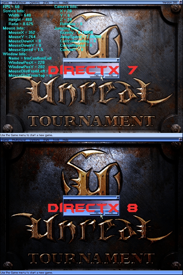 First off, I just want to say that I didn't even bother trying to upload the source to VBC since I already know it can't handle a 5MB file. =) However, there is a link to the file below. Alrighty, down to the nitty gritty. This update is jam packed with new goodies. I have revamped almost the whole code for the DirectX 7 version. It uses my own "engine" so to speak. But I'm sure you're asking "DirectX 7 version? There's a different version?" Yep, that's right. There is. I've ported the clone to DirectX 8. Woo hoo! I haven't coded the 3D aspect of it, but I was able to create a DirectX 8 "engine" to do all the 2D stuff. That's right. I said 2D. It took me awhile, but I figured out how to do it. And I didn't use anybody else's code. Cool huh? =) Anyway, you can see from the screen shot that the DirectX 8 version looks a lot different. You wanna know why, right? Well, I couldn't tell you if I wanted too! Because I don't know! For some reason when I ported it to DirectX 8, everything became really dark. Guess I'll have to figure out some Gamma control stuff. Anyhoo, I hope you enjoy it. The links to the files are located below. Enjoy! Oh, and I wouldn't be a true VBCer if I didn't ask you to do this, but, would you guys please vote, or at least leave some comments! They are appreciated ya know. =)
