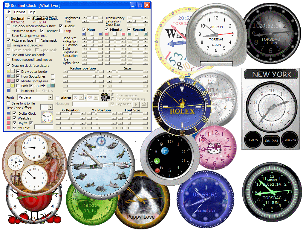 In this updated version, you can select your own picture as clock face, or draw one with the built in functions. Select your own clock hand picture, or use any of the built in hand styles. Create both decimal and standard clocks. Save your clock to a disk file. This files is associated to the exe-file, and can be started if double click them or when Windows start. This project including 27 sample clocks created in this application.