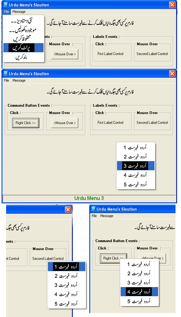Another solution for Urdu Programming ! This is the first Solution for making Urdu Menus in VB6. There is a example code of Urdu Menus on VB6 forms, you can understand by this code that how you can make Urdu Menus & deal with them.Two things are shown in the project, 1> How to make Top menu of the form, 2> How to make right click menu & appearance of that menu with 'Click & MouseOver' events. MS Form 2.0 Object Library again used in this project. There was no special need to use that object library but used because i think, that library objects are more reliable for Urdu programming because of there extra & specialized properties. No external source needed to make Urdu Menus. Checkout, I hope you all will like this Solution. Like before, Waiting for you Feedback at my E-Mail Address. Thank You.