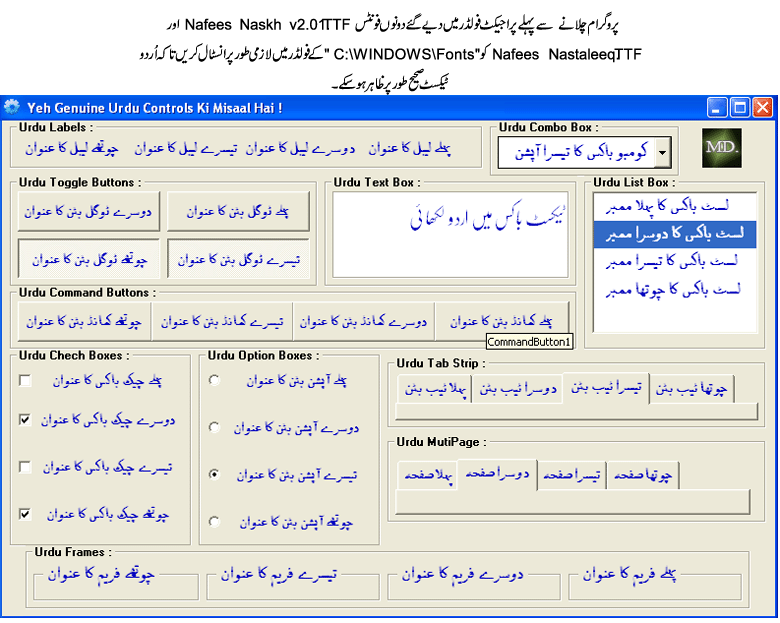 Introducing first time on the whole world of internet, there are all Urdu Programming Controls in VB6. You will not be able to find anywhere else. When I've started to fight for Urdu Language's Programming, i realized that there are no Urdu Programming Controls (UPC) available anywhere, that programmer can use for there Urdu Language programming. So, it is a effort by me to solve this problem. These are only the 'Simple' controls to show only that how these controls can be made and used in VB6 applications. I hope, all beginners & professionals will like it. I 'll feel glade to get feedback from all buddies. Please give me your feedback on my email address ([email protected]) about this code, Also must rate & vote for this code on vbcoders.com. Thank You.