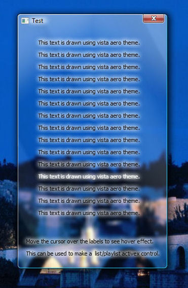This code shows how to use dwm API provided in windows vista to create a glass window and draw a theme text on it with hover effect.