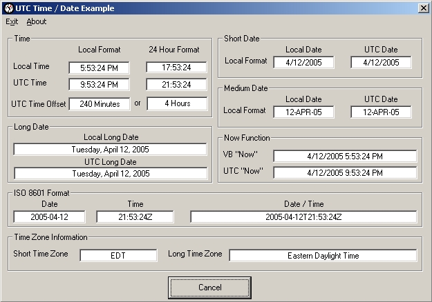 Updated 12-APR 2005! Add UTC time offset from Local time and formats Time / Date based on country/regional settings. Function module for getting UTC (GMT) time and date. Demo program shows how UTC functions relate to standard VB time/date functions. Being a Ham Radio and Shortwave geek, I needed UTC time a lot for logging and schedule time conversions. Comments welcome