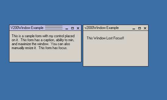 This control, when dropped on a borderless form will size itself to that of the form, and wala you have a new window. The window has all the abilities of the normal windows, it can be maximized, minimized, and can be manually resized. Also has a nifty lost and got focus effect, like that seen in Visio 2000 Professional. If you like this please drop me a line and tell me, or if you want to see something in it that isn't and don't know how to do it then let me know and I'll try. Once you load the control, click on the (Custom) property to see how to set up the form focus effect (only 2 lines)