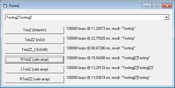 A test program is included for comparison which shows the bugs in other implementations. Also a bit fuzzy logic RTrimZZ is included: it is fast, but it is mostly dedicated to cases where you expect a buffer full of NULL, except for the actual data at the beginning of the string.