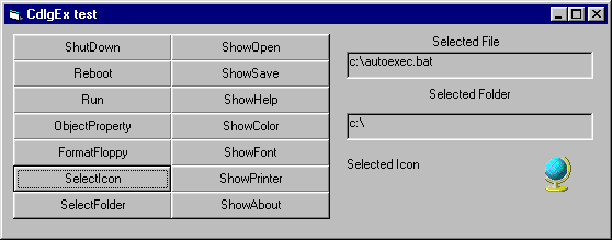 Class with various windows dialogs - including standar common dialogs (open/save, print, font, color and help) as well as other (select folder(with pre-selecting ability), select icon, shutdown/restart, run file, Object Properties (ie. System, Printer, Disk, File etc.) and AboutBox. Add this class to your app and forget about comdlg32.ocx.