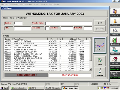 A simple system used to calculate VAT input, witholding tax of a certain vendor and VAT output/VAT output (exempt) of a certain customer. Transactions are converted into a text file and can be remitted to BIR (Bureau of Internal Revenue) office.