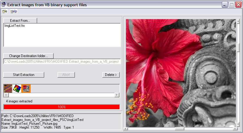 However end-users have a problem; they are stuck with your graphics. With this program you can extract graphics (bmp, gif, ico, jpg, wmf (some loadable image classes extract as a different (legitimate) type; cur as ico, dib as bmp, jpeg & Tiff as jpg) from the binary files. The image may need editing or you might just want it to use in your own purposes (Ask first;)). Perhaps you want to reuse an image you included in your own code but can't remember where you stored the original? Another use is to extract large Bitmap graphics, convert them to Jpg (or other small files types) in almost any modern (that rules out MSPaint then;)) paint program and reloading them into the project. This will shrink the code considerably and often improve performance as the memory impact is lowered (there is some debate about this; VB has to do more work to display non-BMP images but the data is much smaller so may process more quickly). To assist with this the program names the files it produces with the format 'Form_Control_Property' making reloading them much easier. This code can also extract from ImageLists.