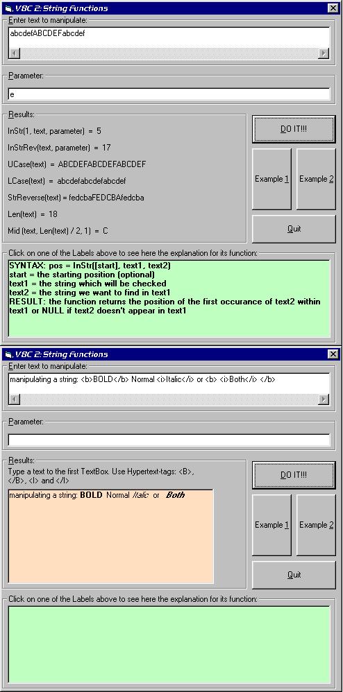 It's the second part of my huge VB Compendium. This project has two examples on how to manipulate Strings (and print formated text to a PictureBox) The first example is only to demonstrate some VB String-functions; the second uses them to format a text with hypertext tags. Part III soon available ;) If you like any project please vote for it!