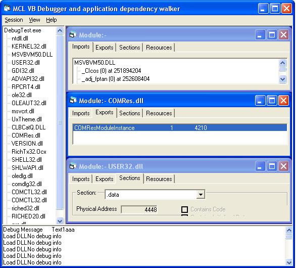 The modules list in the right hand pane will be filled as modules load. To get extra information about a given module (for exampl,e the imports and exports listing) double click on it and a form will open for each running module.