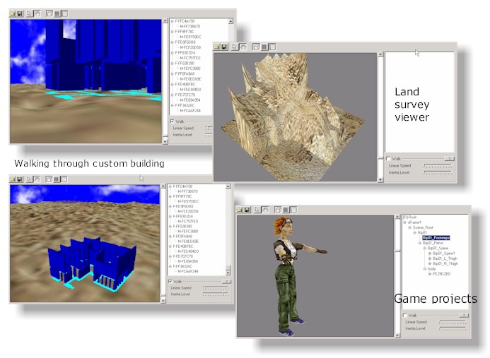 Free DX8 control to build simple 3D scenes, load 3D DXF, X , lands and custom files. Walk mode, trackball mode, easy texturing, 3D world simulation, object tree.