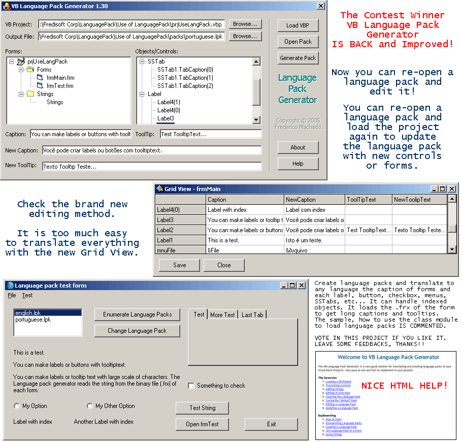 VB Language Pack Generator is a Powerful and complete application for you to quickly generate language packs to your VB projects. You need to load a project, and translate your labels, menus, buttons, SSTabs, etc... It is able to translate control arrays and indexed menus too. It can load large captions or tooltips from the binary (.FRX) file of the form. The example, how to use the class module to load language packs is heavly commented. NOW IT HAS A Grid View to fast editing controls of forms and strings. YOU CAN RE-OPEN an existing language pack to edit and save again. YOU CAN UPDATE AN EXISTING language pack by re-opening it and re-loading the project to add new controls and forms to the pack. Vote for me if you like it. Feel free for give me some help to implement it. Thanks!!