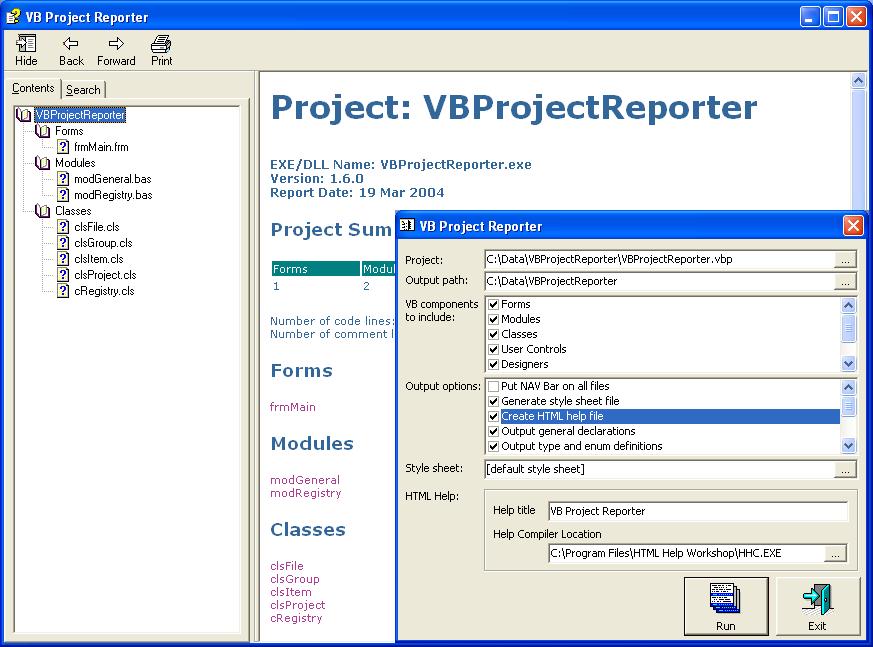 This is the latest version of the VB Project Reporter, a source code documentation generation program originally written by 'kerlin'. I have now added support for all the VB document types (.vbg, .vbp, .bas, .cls, .frm, .ctl, .dob, .dsr, .pag). Also new in this version: documentation for form/module level declarations (variables and constants), types, enums and API declares; comment lines at the beginning of a file are included in documentation, as well as comment lines preceding and following sub/function definition; total code and comment lines are tallied; more version information from the project file is included; procedure attributes are now included, where defined for a procedure; an expanded interface allows all components to be switched on or off. Output is to HTML with style sheet controls, and optionally (if the Microsoft HTML Help Workshop software is installed) the program can generate HTML Help files (.chm). The style sheet can be overridden if required. The program has been re-written to use classes. I'd appreciate some constructive comments about the code, along with any ideas for new features. And if anyone knows how to extract meaningful information from a .res file before it is compiled into a VB program, I'll add more detailed info on resource files to the documentation. The program uses a registry class written by Steve McMahon (www.vbaccelerator.com). Thanks to 'Eugene', 'Adrian' and 'PROBRO' for the suggestions implemented in this version. Bug Fix: Corrected some out of bounds and Type Mismatch errors. Updated 31 Aug 2004: Fixed a couple of small bugs.