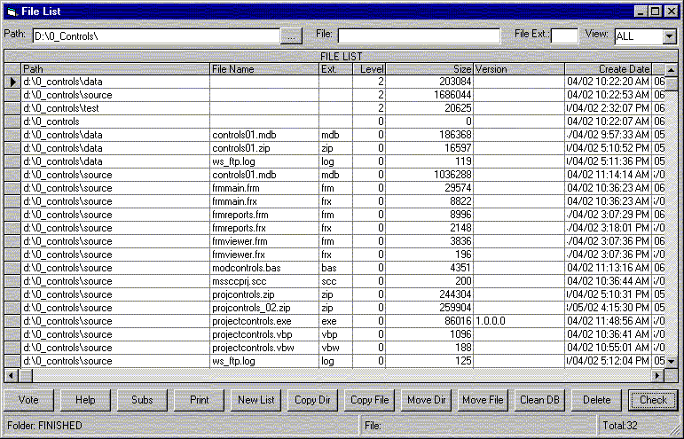 This program allows to create the Database of all VB Subs/Functions/Folders/Files on your computer. You can view, find and manipulate with Forms, Modules, Subs and Functions and create new modules from the subs and functions you already have. First step is to create database of all files. Enter Path (For example: C:\ ) and press Check button. If Program failed most likely you have corrupted file (The file path could be found in c:\LastFile.txt file). Try to look at properties of this file, delete or move it and start program again. After several iterations Database will be created. It could take up to 20-30 minutes to complete the job. After Database of folders and files was created you can do the following: Select by File/Folder Path (Put Folder/File/File Ext. path and hit Enter) Select by File Name Select by File Extension Order Selected Folders/Files by Path (Click on Grid Header) Order Selected Folders/Files by Name Order Selected Folders/Files by Suffix Order Selected Folders/Files by Level Order Selected Folders/Files by Size Order Selected Folders/Files by Version Move File Move Folder Copy File Copy Folder Delete File Print the List of selected Folders/Files Open several File List windows (I usually use this mode for DLL/OCX/EXE file size version check) Now you are ready to start creating list of subs and functions you have in all files. Press Subs button and after that Check button on Subs and Functions form. Program automatically looks through the list of all VB files found on your computer and creates the list of Subs and Functions from all these files. It could take another 10-20 minutes. Depending on the number of VB files. After the list of Subs and Folders will be created you can start manipulating with these files. To Find File /Folder/Sub just type in the name in appropriate field and hit ENTER. To Order by selected column click on the Column Header. To Extract the Sub/Function hit View Sub To Add extracted Sub/Function to the File hit Add Sub (Make sure that the file Path was defined) To View result file with all added Subs/Functions hit View Res button. As a bonus in modFSO module you'll find most of the functions and subs required for Disk/Folder/File manipulations. Do not forget to add reference to Microsoft Scripting Runtime (scrrun.dll) in the project. Good luck and all the best.