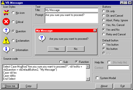 Creating MsgBox code can be frustrating. No more. Use this simple "one screen does it all" application to create MsgBox source code. Nice interface, enough options, view the MsgBox source code straight away and a preview. Once you are happy with your design, it will copy the required code into the clipboard. Enjoy.