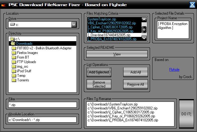 UPDATE 7/19/2005 12:38 PM: Implemented both Aly's Suggestions. 1) Unzip32.dll is included in the resource file and will be extracted if it does not already exist (if for some reason you want to alter my resource file and VBC deleted the original unzip32.dll in the Res folder, the DLL file is located on the zip file in that folder) and 2) if a ZIP file contain no @VBC_README*.txt, the project name textbox will state that no readme file was found and if the user tries to rename that file, the program will not allow it (skips over it and at the end states why for all skipped files).