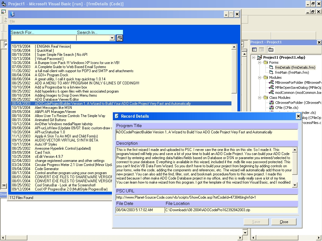 Over the years I've collected quite a few code and program examples. The problem is that I may know I have an example of how to do something, but I can't find it. This program will open a downloaded file and parse the VBC-readme file, then insert the information into a database that can then be search on. I hope you enjoy it. Please read the readme file prior to running the code as there is a free dll that must be downloaded from another site first.