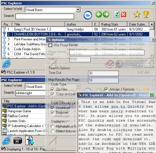 This is an Add-In for Visual Basic 6 that allows you to Quickly See what has been newly submitted to VBC. It also allows you to search VBC Quickly and view the screenshots of the submissions if available. Also By double clicking the item you can navigate to VBC to read more about the code and download it. Add-In is Dockable in the VB6 IDE. - Fixed Minor Bug with Multiple worlds in search. - Added Stop, Refresh Functions. View Multiple pages From your search now. Changed the UI a little bit. Commented more parts of the code. Please leave your comments so I can Make this Add-In Better. - *** Now you can also download the Zip files form VBC by just clicking a button.