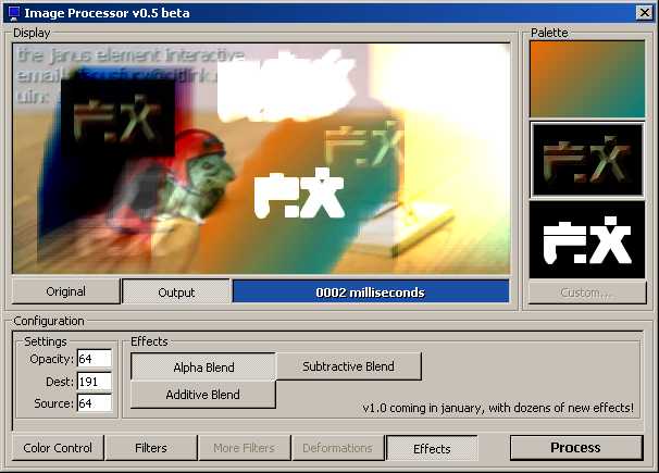 Demonstrates using GetDIBits and StretchDIBits to manipulate images, and also shows fast ways to do alpha/additive/subtractive blending, and a variety of effects.