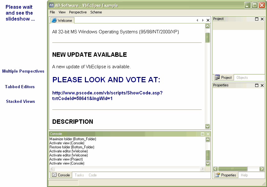 Version 0.8.99 of the VbEclipse project is available now. Please look at the screenshots. PLEASE VOTE AT https://www.VBCode.com/vb/scripts/ShowCode.asp?txtCodeId=58641&lngWId=1.