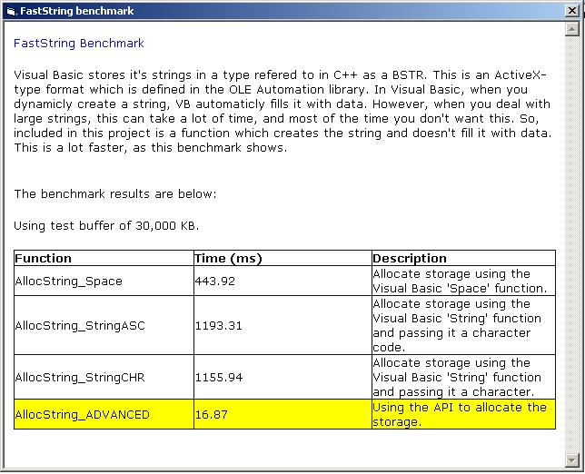 This tutorial shows how to dynamicly create Visual Basic strings up to 150 times faster by calling the OLE Automation library directly. Please vote or leave a comment.