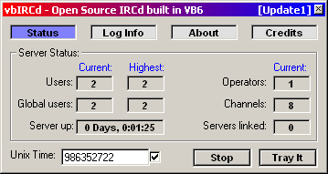Here's Update2 of vbIRCd which is v1.0.48 and I hope you enjoy this since it has a few bug fixes and another things. See Change.log file for details. -=- vbIRCd Support Forum at https://vbircd.ircd-net.org/forum