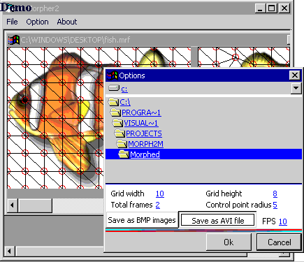 THIS PROJECT IS A MUST SEE!. Ever wanted to create morphing movies like you see on tv, well now its possible. This project is an improvement to my last Morphing program submission. With this version, you can create an AVI video file of your morph, or you can choose to save it frame by frame. My last attempt a morphing produced excellent resulte but was rather slow, this one produces much better results and the speed is simply LIGHTNING. Just look and see!