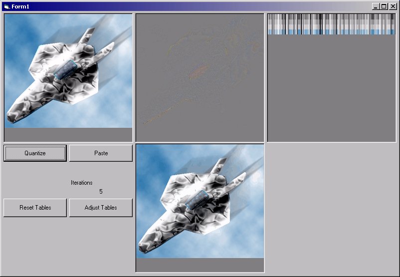 This is my take on Vector Quantization. The idea behind this is to use a table of colors, then approximate which index of the table best matches each pixel in the image. After this, the table is adjusted based on the input values, and another test is done. After about 10 iterations, a decent image should be constructed. Now, unless you modify the code, this new image is made up of 128 colors. Yes, colors, not levels per channel. The trick to better images is to add just a little bit of noise to the original. Having 'slow' gradients in an image will take more iterations to estimate, and may still look bad. I used DIBits so there shouldn't be too many problems. I did however limit the size to a max of 256 colors in the table tho it is possible to change. Also, the images are set to 256x256 pixels. I planned on using this as a start of an image compression tool. If you have any suggestions that would help, please let me know. At the moment, I am working out a way to use a huffman tree to compress the pointers to the color index. Anyway, tell me what you think, good or bad.