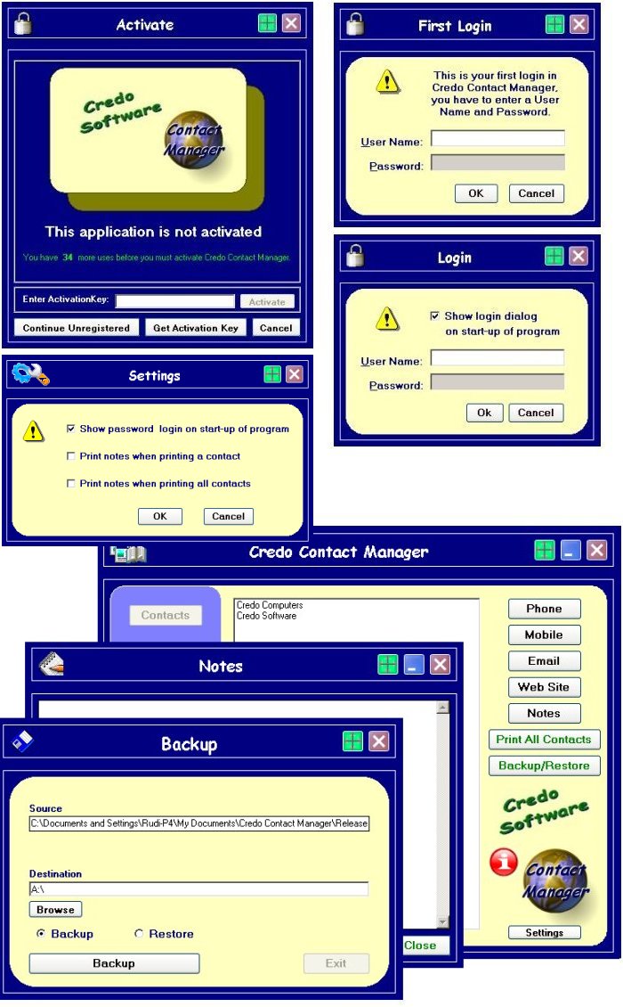 A Complete Solution for Contact Management - Address Book. Credo Contact Manager Ver. 2.0.1 is an easy to use management software program. It has a build in trial, registration or activation solution. It is a password protected Contact Manager with the possibility to disable the password login. Also you can make notes of all your contacts with a build in text editor. You can backup all your contacts and notes. Email client and a phone dialer is also included (modem required). Web links of your contacts will take you straight to there web site. No database required. ... SOME BUG FIXED AND ADDED PRINTING OUT CONTACTS (SELECTED CONTACT, AND ALSO ALL CONTACTS).------------------------------------------- Updated again on 03-12-2004 16:40 (UK time) BUG FIX PROGRAM START AFTER ACTIVATE.----------------------------------------------