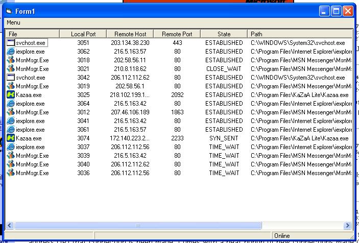 Using the AllocateAndGetTcpExTableFromStack API this returns a instant collection of all connections made by your computer showing them in a listview and have there appropriate application icons, also allows you to terminate a appication or close a connection. take a look at screenshot.