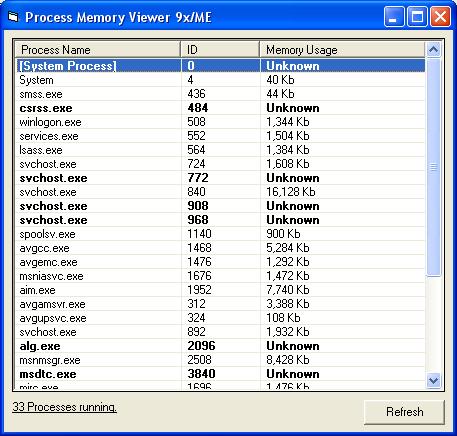 Easily view the amount of memory a process is using. Works on all Windows OS's (well at least 9x, ME, 2k, NT, XP). Take a look. Please vote :). Let me know of any bugs/comments or features ud like to see :)