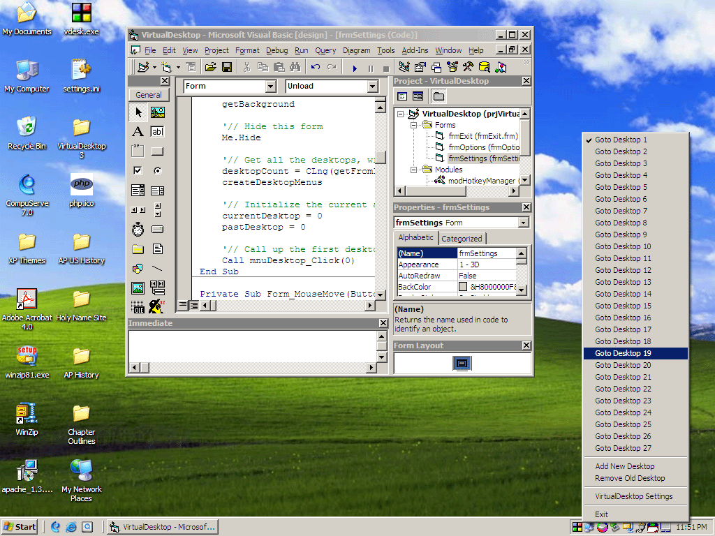 NEW Version 3.0! COMPILED SETUP AVAILABLE, SEE BELOW FOR INFO. NEW FEATURES AND CREDITS BELOW. Do you have so many programs running at once that you go crazy trying to keep at least a little organized? Do you want to be able to manage multiple desktops like you can on Linux/Gnome-based interfaces? VirtualDesktop is the exact answer to this problem. This simple yet powerful utility will alow you to have up to 10 'virtual' desktops running on your system. It does this by scanning for valid windows (ignores tasks) and manages them with API calls. This code is well commented and not very large. I hope you like the utility and please comment to help me improve it. Please vote. Thanks.