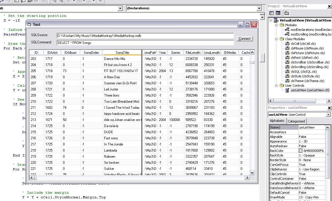 This is a comprehensive implementation, written purely from scratch, of a virtual list view using a wide array of COM classes. Furthermore, it supports custom skins, XP skins natively, and a SQL connection withou much hassle. The ZIP-file includes a test project that shows you how to use this control in a project.