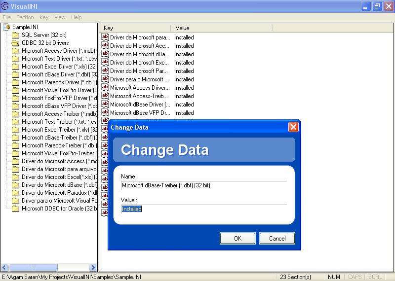 Visually Create, Edit and Modify INI files. Its worth looking at the screenshot. Much like regedit but designed for the modification of Configuration files. You can Create/Modify/Delete Keys/Sections. The Modify Dialog is shown on the basis of the type of data contained in a value. For example if data containes path for some file, it adds the browse button in front of the textbox.
