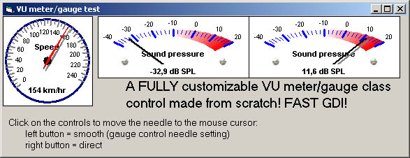 This class displays a fully customizable VU meter / gauge control (see screenshot). Needle animation included to make it move smoooooth (3 types). ALL parameters can be set and all objects of the gauge can be scaled (X and Y).
