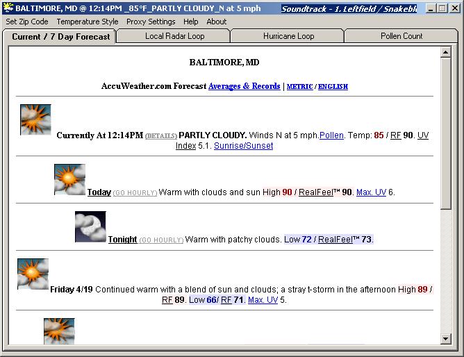 Displays the current weather and forecast for 7 days. Also has tabs for Local Radar loop and a East coast Hurricane watch loop, and also a pollen count tab. When minimized it has a mini weather form with current temp and conditions image. Can also be fully minimzed to the tray. I download the webpage code and make a new local webpage based on what I am looking for and then browse to the local page. Let me know what you think. Later