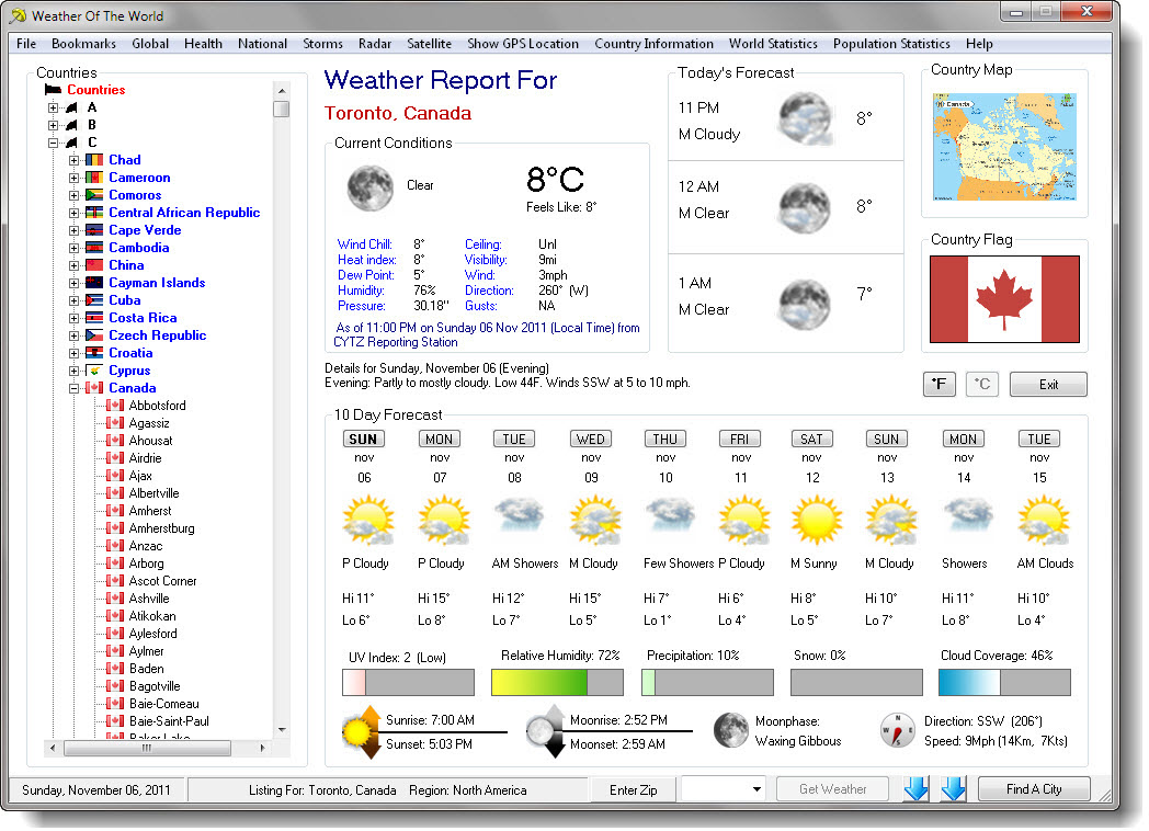 This is the ultimate weather program, Weather Of the World will give the weather of all cities in ever countries, Hurricane Tracking, Flying to and from other Countries, their G.P.S. location, facts & statics about that country, time & date, Airport Arrival listing all major airports of a country, Airline information of every airline of all countries, Air quality & UV control report, international calling code for all countries and many more new feature . I have remove the LVbuttons.ocx from program so there will be no need for ocx registration. Made changes to hurricane tracking that did not work properly when there was no hurricane to track. please vote and or give any suggestion you may have. also many thanks to all the programmers on P.S.C. that I have used snippets of their code to create Weather Of The World.