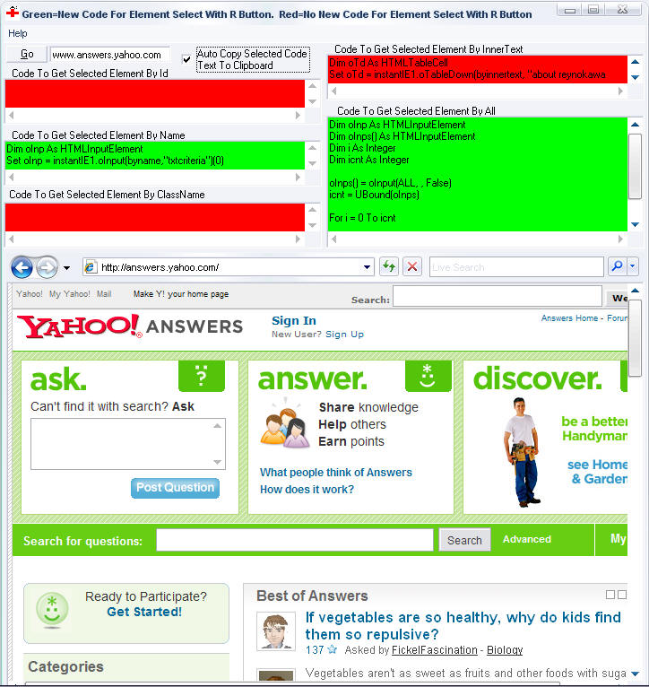 ability to easily, with 1 - 3 lines of code, get a handle on almost any element in the webpage based upon its .id, .name .classname, or innertext. So if you wanted to created a webbased application that automatically navigates to the yahoo email webpage fills in the username and password and clicks the submit button for you automatically this control gives you the ability to do that in a hassle free way. By setting property [Control_Mode] to (code_mode) you can easily and quickly get the code necessary to get the handle to each of the webpages elements so you can manipulate them i.e. the above example given with yahoo. The way you do that is this. Using the above example, after setting the [Control_Mode] to (code_mode) navigate to the yahoo login page, right click the username textbox and in this forms textboxes the code necessary to access and manipulate that element is immediately present via the username textboxes .id, .name, .classname, and .innertext properties. Click on the textbox that has the code you want and it automatically copies it to the clipboard for you. I not only welcome but strongly suggest ideas for improving this control. With all the webpage programming I do I finally got tired of all the same code I had to write over and over again to access and manipulate a webpages elements and the creation of this code/control is one of the best, most time saving utilites I have ever created and I hope you feel the same. There is very little documentation when it comes to programming and manipulating webpages and its underlying document so I feel this control would be very very helpful to lots of coders here. Your voting will tell me how it is and your suggestions and comments will help me make it even better!!"