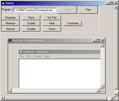 Make a non-mdi child window, and inside of that insert a whole other program, so... a window in a window in a window... this is not my code, its code from a number of sites.. www.vb-helper.com, allapi.net, freevbcode.com, VBCode.com, elitespy, a bit here and there, thanks everyone, and if this helps you than feel free to either vote or just go to those sites.
