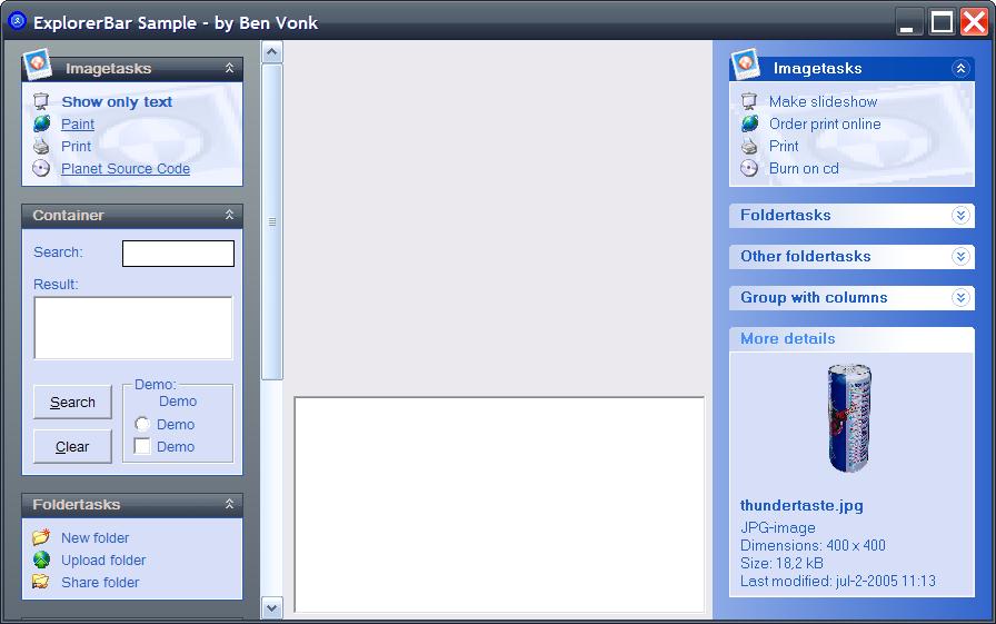 This is a Windows ExplorerBar control. Based on the idea of Alex Flex's 'XP-Style ExplorerBar control'. It is completely redesigned with a lot of settings and functions.