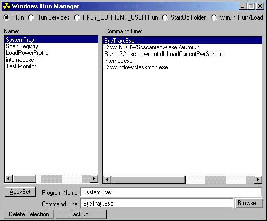 this application enumerates and allows you to modify the registery run, run services (under HKEY_LOCAL_MACHINE and HKEY_CURRENT_USER),