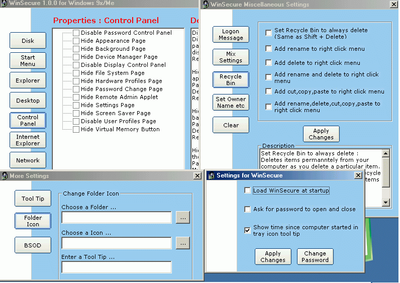5)Control Panel - Disable Password Control Panel, Hide Appearance Page, Hide Background Page, Hide Device Manager Page, Disable Display Control Panel, Hide File System Page, Hide Hardware Profile Page, Hide Password Change page, Hide Remote Admin Applet, Hide Settings Page, Hide Screen Saver Page, Disable User Profiles Page, Hide Virtual Memory Button.