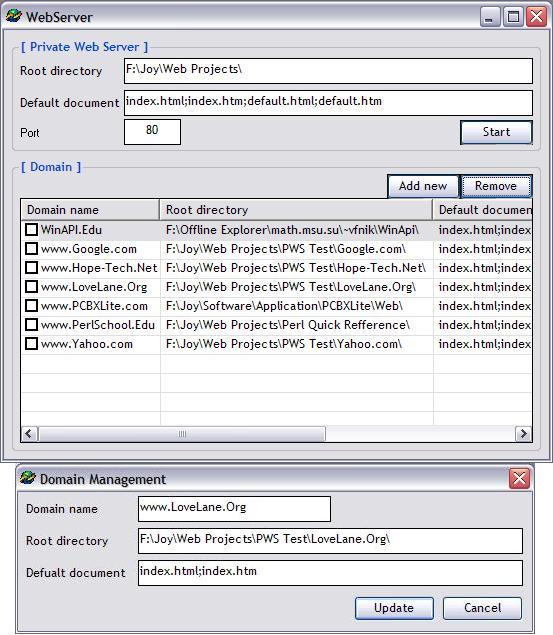 Simple web server supporting unlimited domains and redirections with default document!