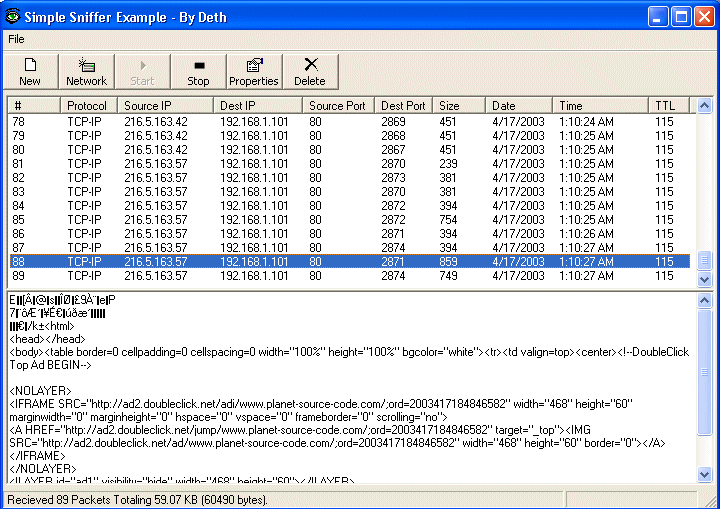 *UPDATED 4/25/2003* This Is A ActiveX Control (ocx) Drop-In Solution For Programmers Who Want To Make A Quick Packet Spy. Pure Winsock API And No Dll's !! Will Only Work On NT Based Systems (nt,xp, longhorn etc)...This was coded in Visual Basic 6, So You May Have To Change A Few Things To Work In VB5...