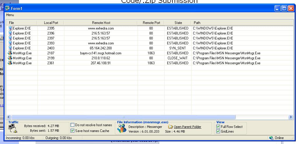 using the xp allocateandgetstack command this program will return all connections comming to and from your computer displyaing them in a listview with their appropriate file icons as well as showing information on the currently selected file, also alows you to terminate connection and/or program. Utilised with a traffic view showing all bytes sent and recieved during you online session as well as bytes/s (look at screen shot) i have also included a manifest file incorporated into the resource file so the program will create its own if one is not found. Many thanks go out to people sharing there code as some has been used in this project i have left most of the comments so gratitude can be shown.