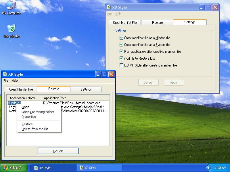 This Application is a manifest maker. It allows you to use Windows XP visual style on your application after you have created them (Windows XP buttons, checkboxes, Option Buttons and etc) and adds your program to registry to use compatibility mode of windows 2000 in order to use XP style with no problem. The restore function is available so you can restore the applications to their original style. It also creates and deletes manifest file for itself so that you can't find the manifest file. Make the EXE file yourself cause if you don't an error will come up! Also I have updated it