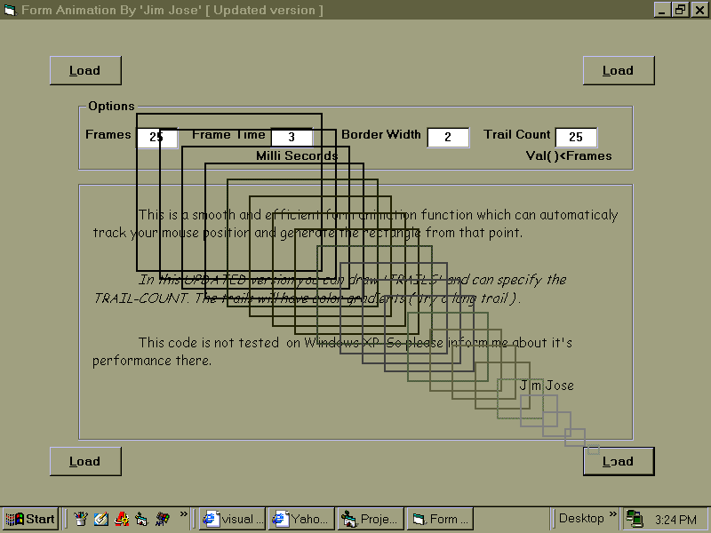 Update-2.... Now there is no need of an additional form. This was my dream function which can animate your form with transparent rectangles during Loading and Unloading. This updated version can create trails for the form and with nicely gradiented colors and adjustable trail length. This function is powerful and works pefect. Thanks to Lavolpe for his great co-operation. Enjoy! and please leave your comments.
